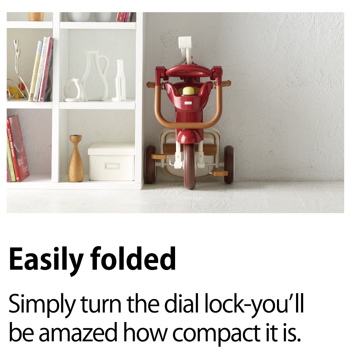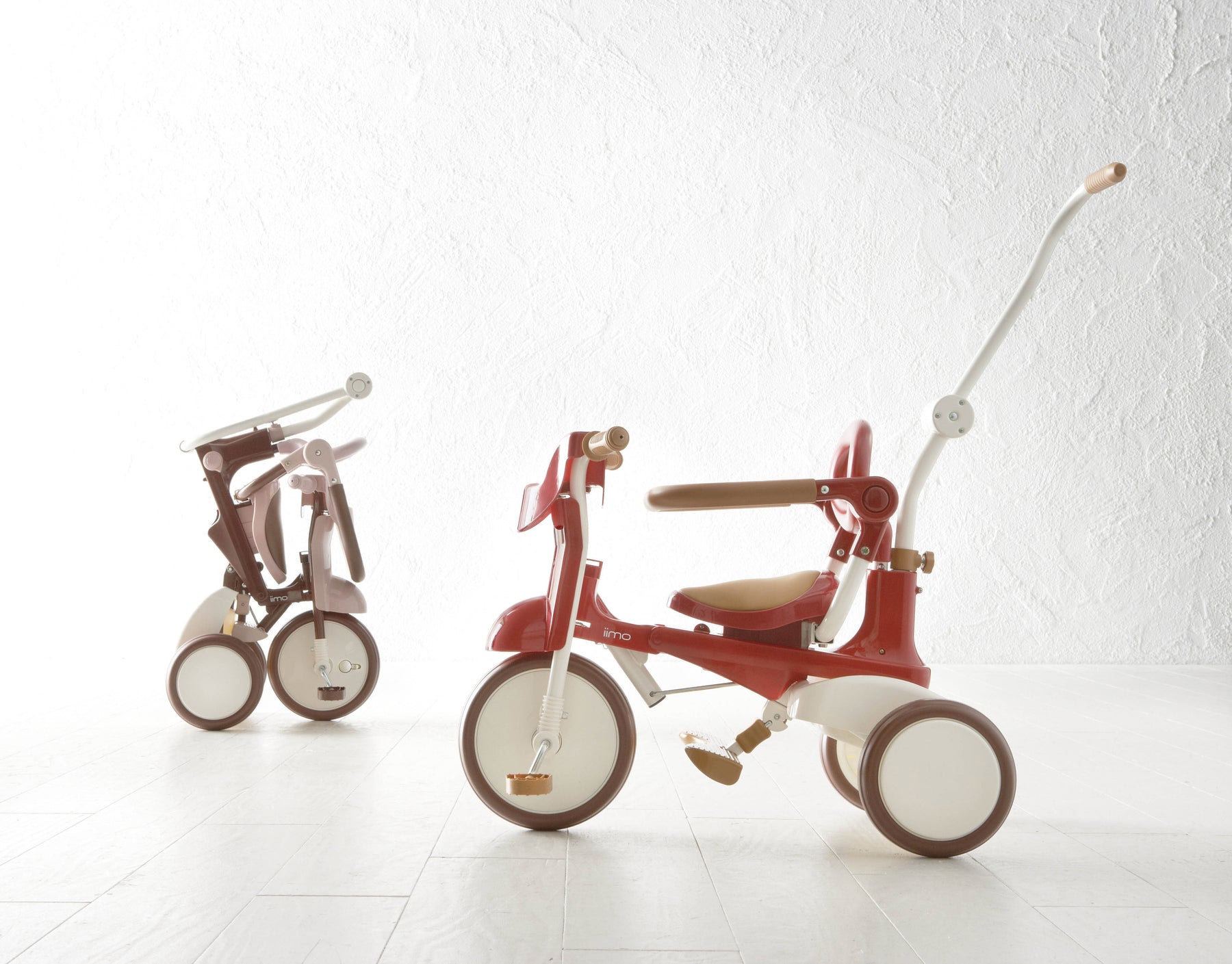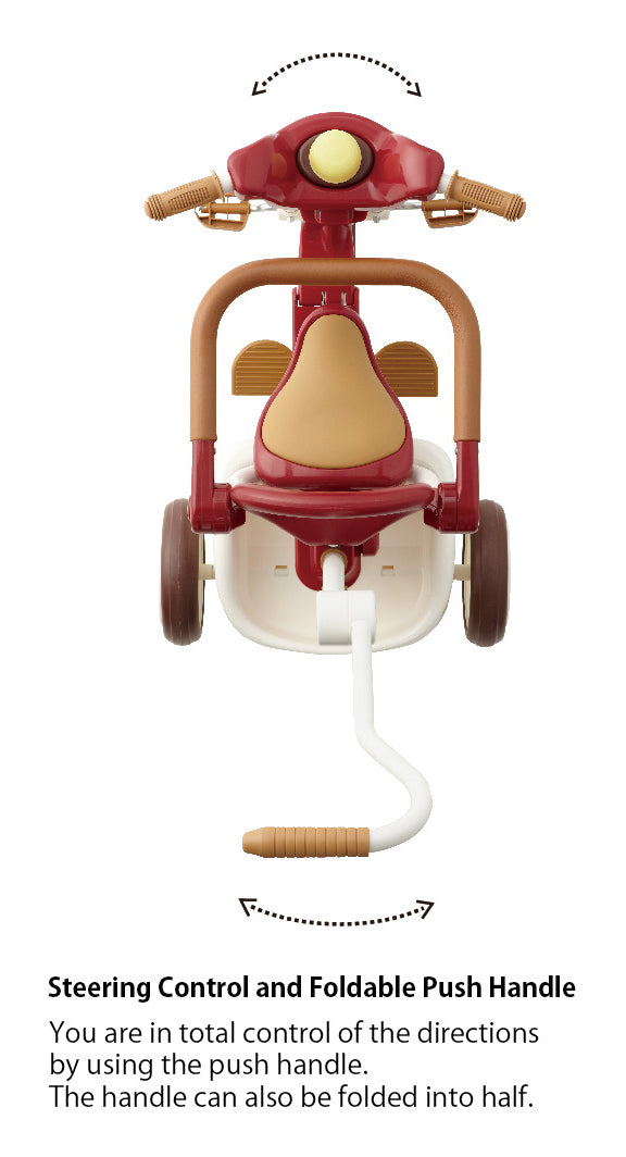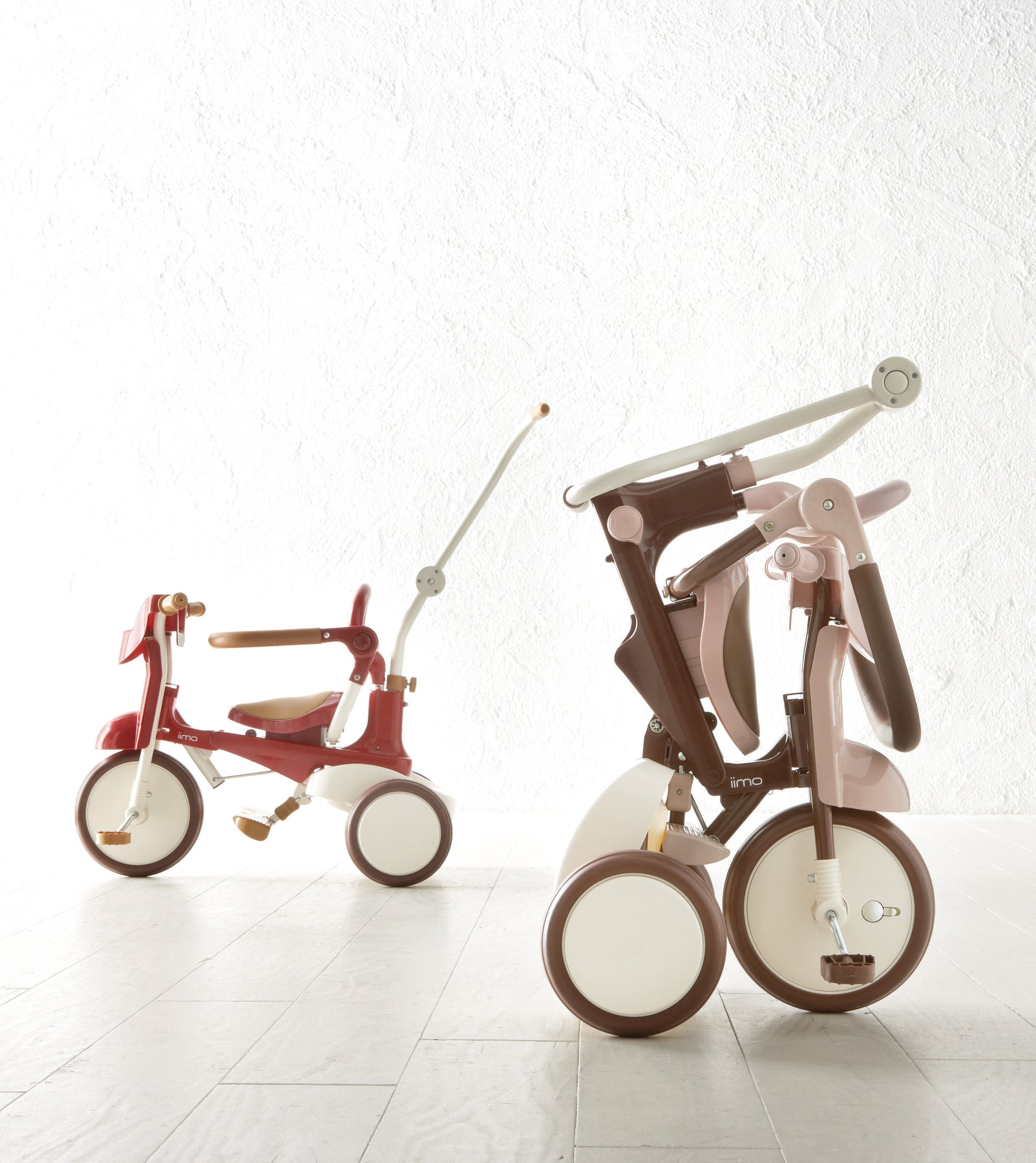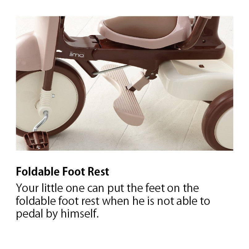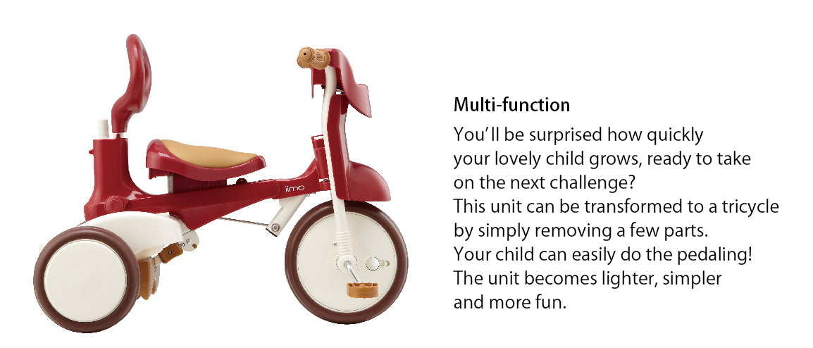 iimo #02 3-in-1 foldable Japanese tricycle for kids. High quality design, sleek, compact and space saving, it is easy to carry and store. iimo #02 converts from push trike to walker to independent pedal tricycle to grow with child.