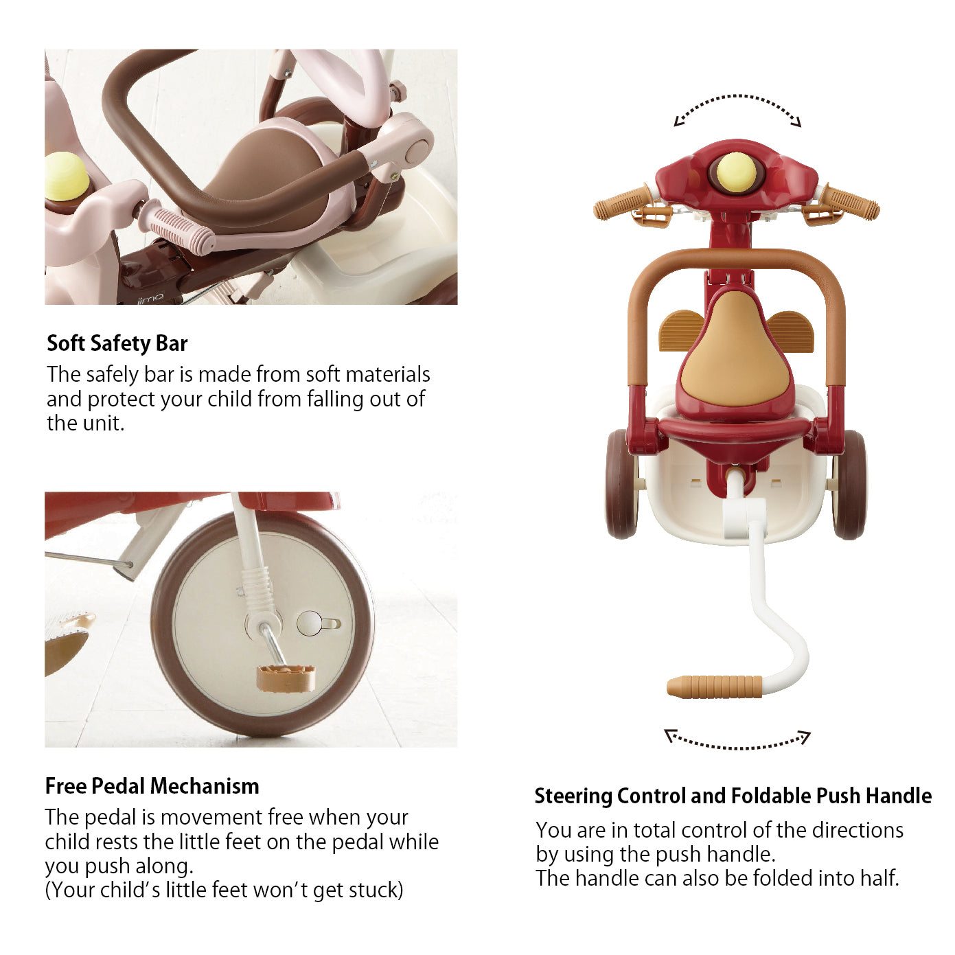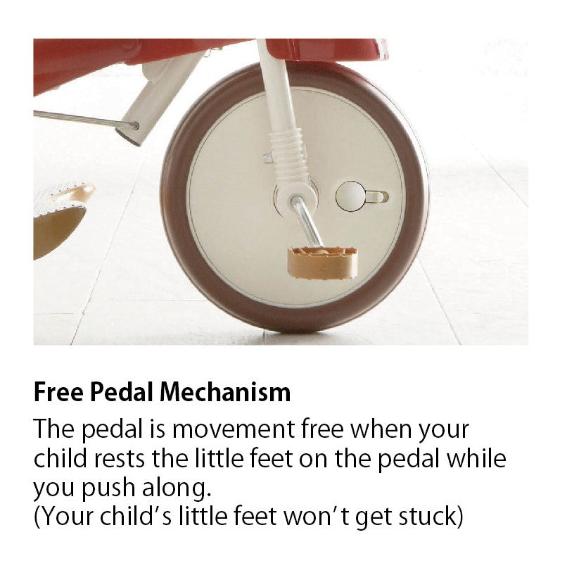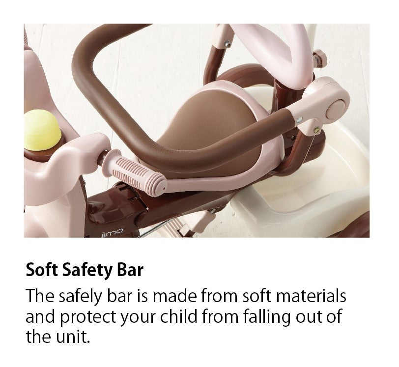 A protective safety bar to keep younger child in the seat can be removed when child is older. iimo has a pedal safety system to disconnect the pedal and wheel to protect younger child’s feet when iimo is used as a push trike. When child is ready to learn to pedal, safety system can be turned off for it to be used as a pedal trike. With a push rod for parents to guide the child, it can be used as a training tricycle to teach your child how to pedal.
