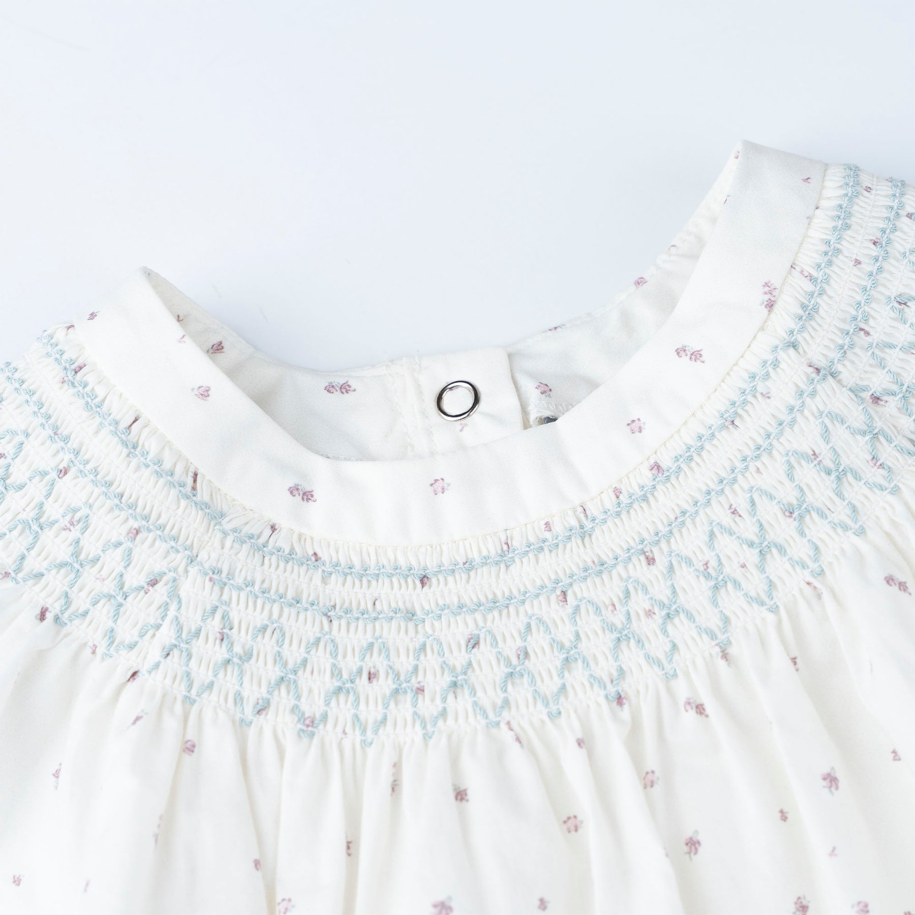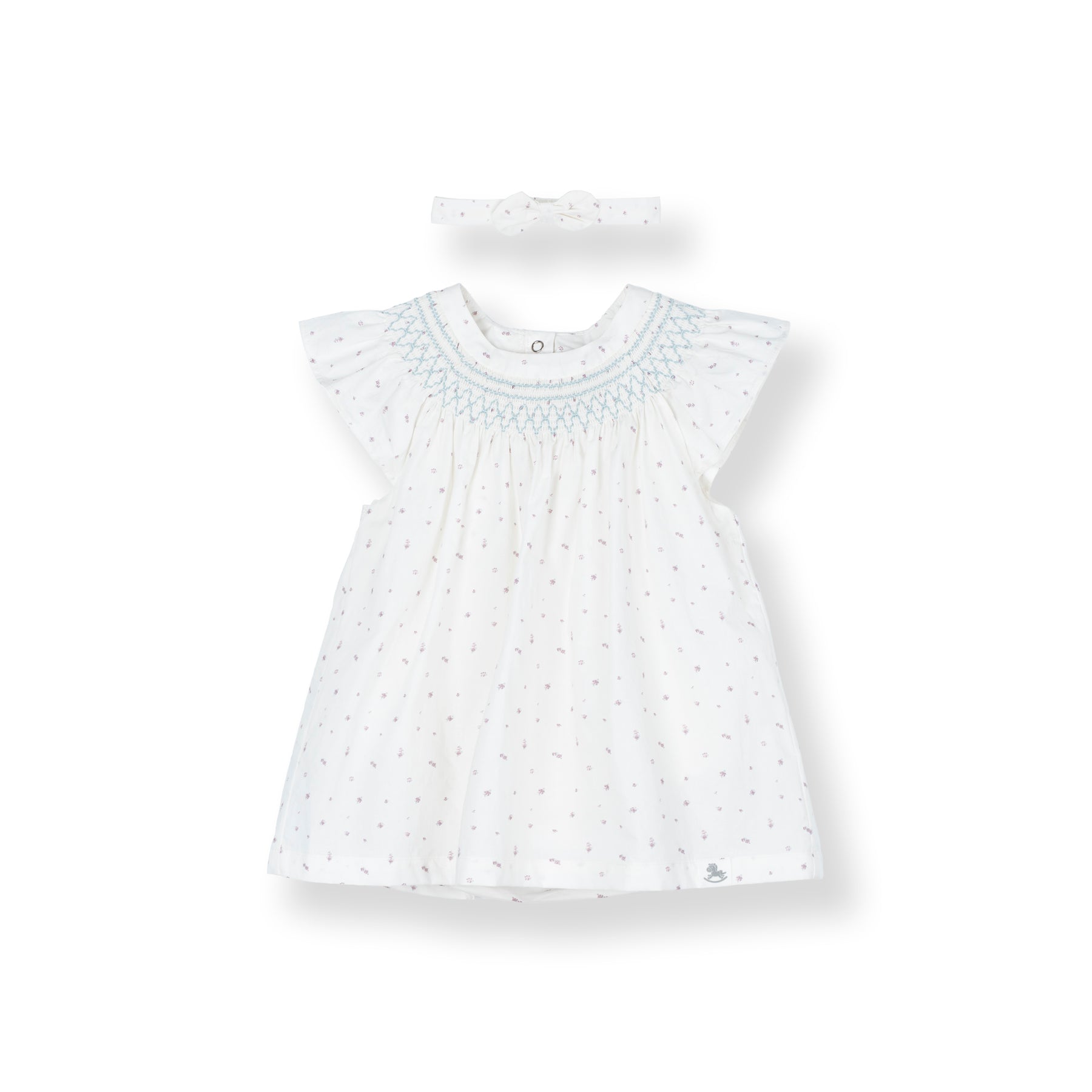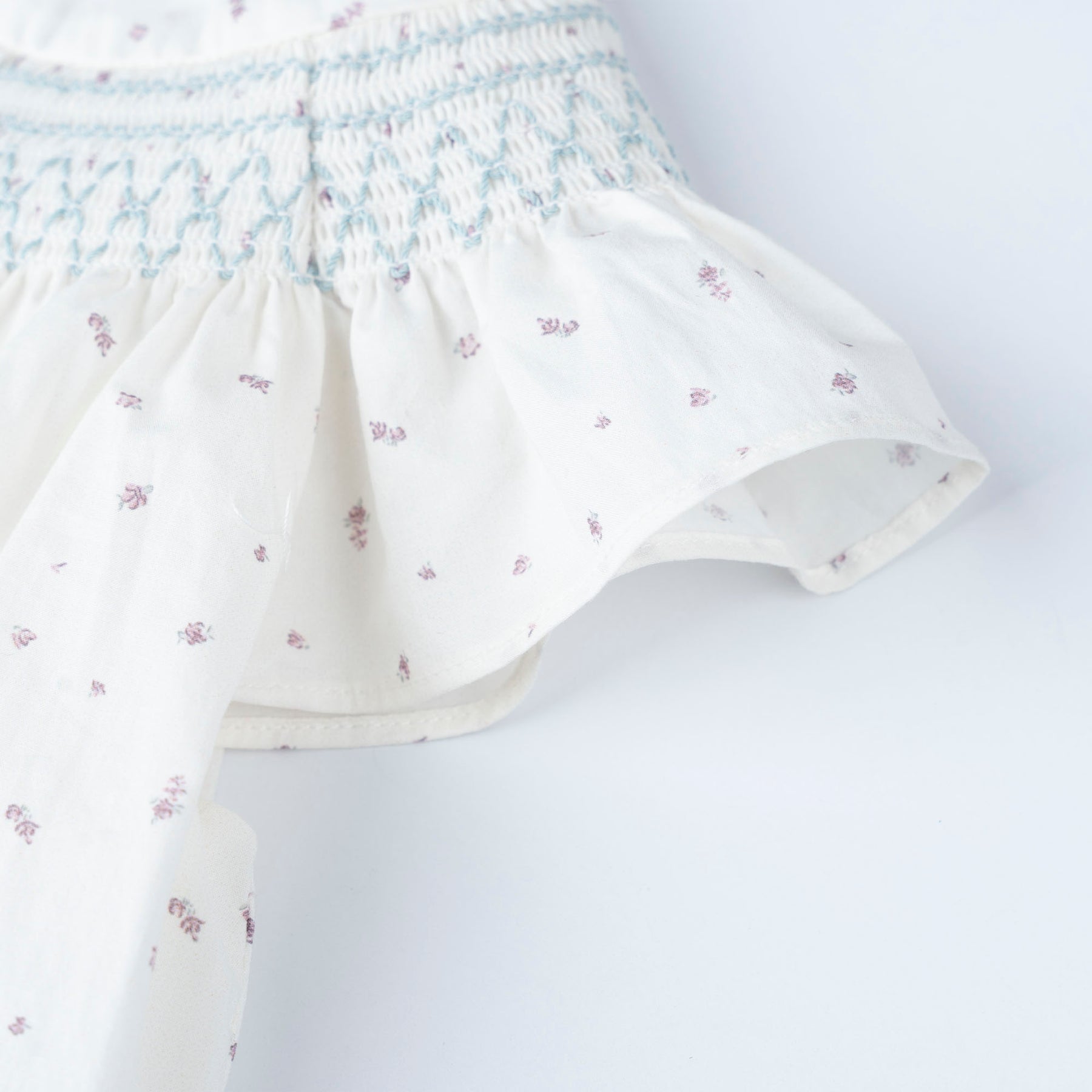 Floral printed dress with frill sleeves and smocking details. Featuring a back snap opening,