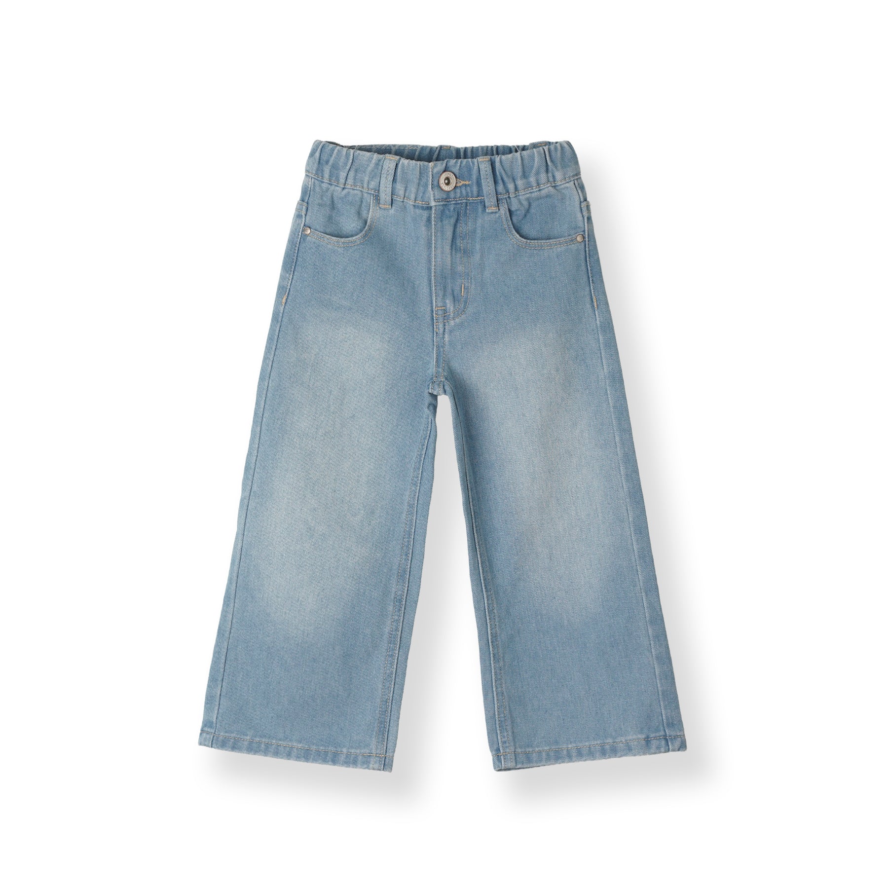 Wide leg jeans with an elactic waistband and front button fastening. Front pockets and