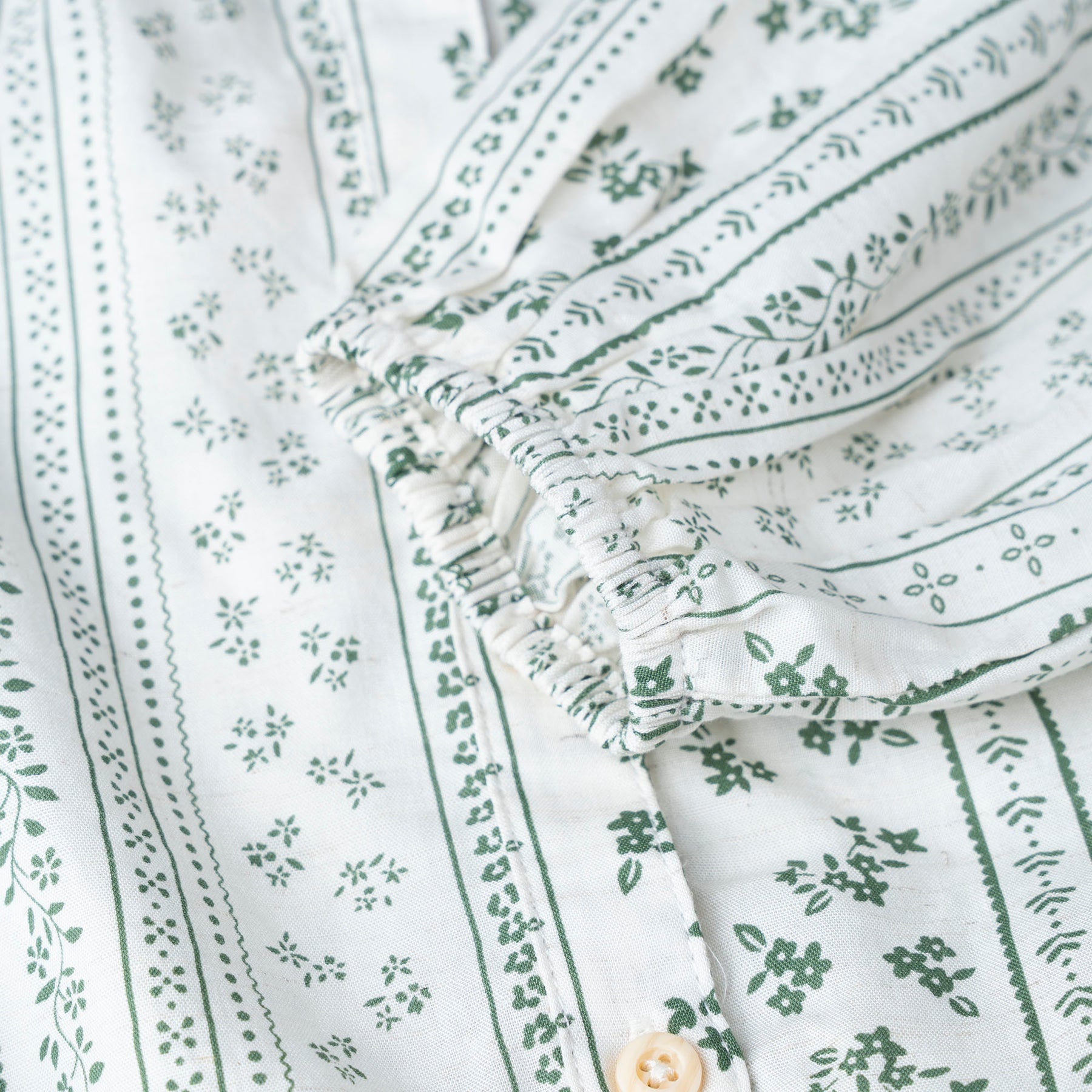 all-over leaf pattern for a nature-inspired look. The gathered neckline and elastic cuffs create