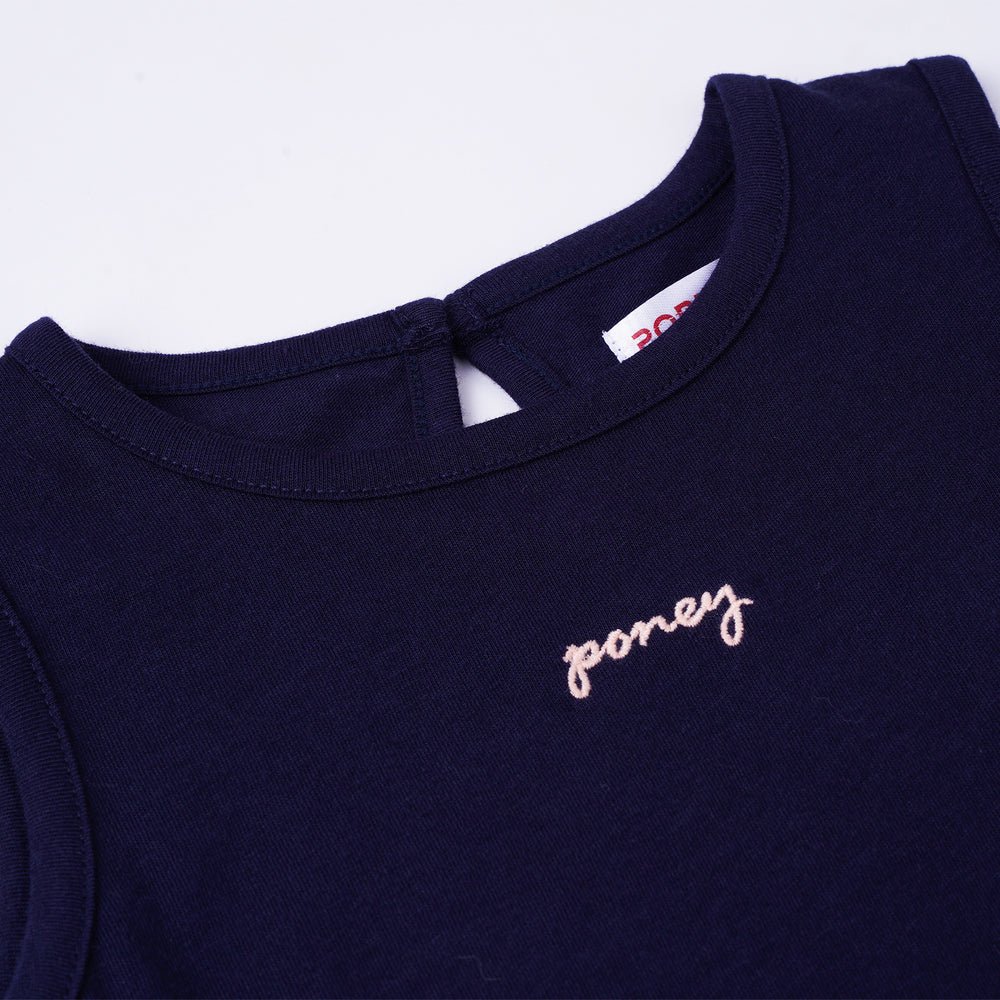 Sleeveless dress with round neckline, gather details and a poney logo. Made from breathable and comfortable fabric, this is another must-have piece in the wardrobe! The gather details on the dress is the perfect mix of comfy and cute too. Comes with a variation of fun and bright colours to choose from.