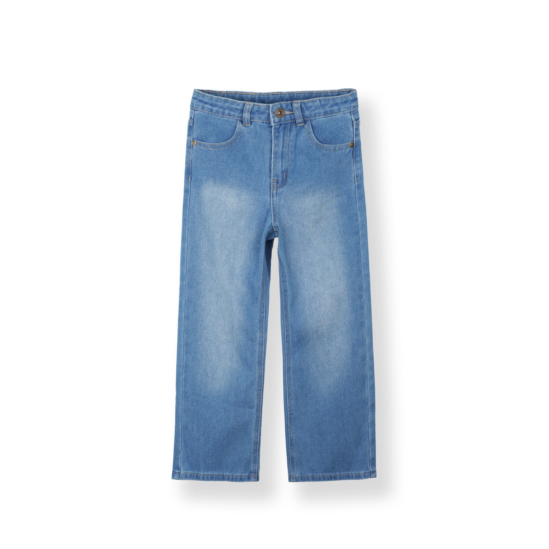 Loose fit jeans with an adjustable inner waistband and front button fastening. Front