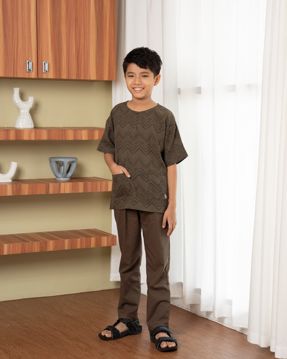 Make a bold statement this Hari Raya with this short sleeve top in a dark color theme. Designed with an oversized cut and trendy drop-shoulder style, it offers a relaxed and modern silhouette. The front patch pockets add a practical yet stylish touch, perfect for carrying small essentials. Effortlessly stylish and comfortable, this timeless piece pairs wonderfully with our pants in the same collection, ensuring your child stands out in any celebration.