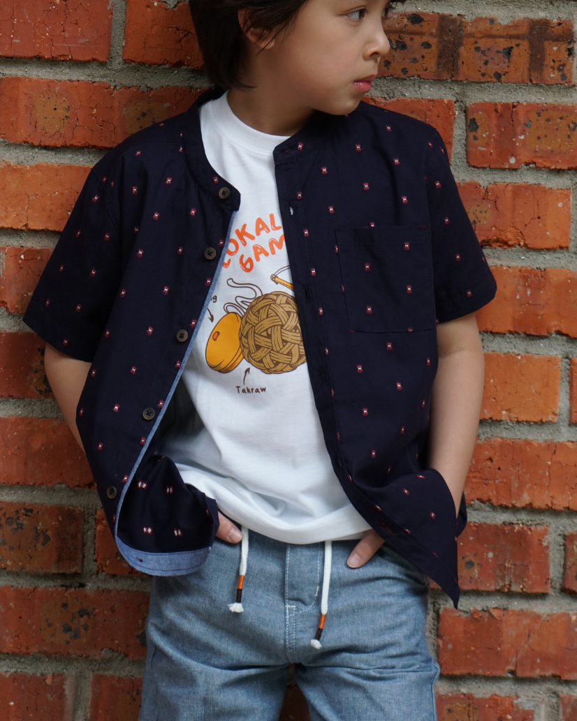 Poney Boys Navy Jacquard Mandarin Collar Short Sleeve Shirt