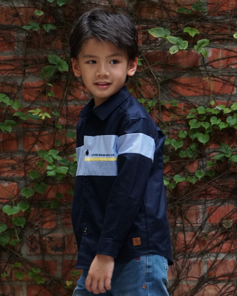 Poney Boys Navy Oxford Color Blocking Long Sleeve Shirt