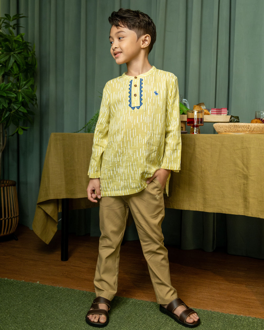 Celebrate Hari Raya in style with this charming boys’ long sleeve shirt in a vibrant yellow hue. Designed for comfort and elegant, it features a classic mao collar with a half placket, beautifully adorned with delicate embroidery. The functional side pocket adds a practical element, making it perfect for festive gathering or casual outing. This timeless piece pairs wonderfully with our pants in the same collection, ensuring your child stands out in any celebration.