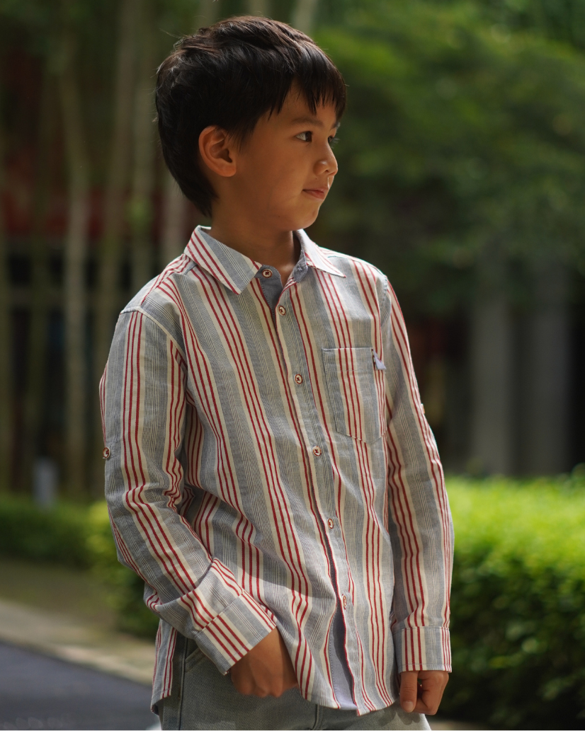 This long-sleeved shirt designed with a vibrant and trendy striped pattern in red, white, and blue. Designed with a button-down front and a classic collar, it provides a smart yet playful look. The soft, breathable fabric ensures comfort, while the single chest pocket adds a functional detail. Ideal for both casual and formal wear, this shirt can be paired with jeans or bermudas from our collection