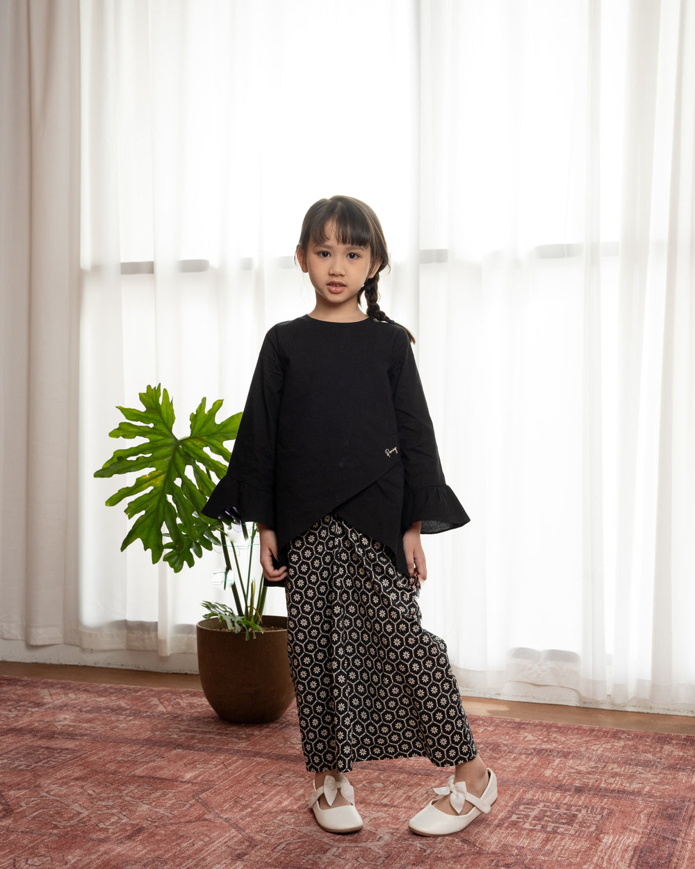 Make this Hari Raya extra special with our stylish and comfortable kids’ top --- Featuring a clean round neckline, long sleeves with gathered flounce, and overlapped design at front. Styled this versatile piece with our matching skirt from the same collection for a complete outfit or other bottoms for different occasions. Let your child shine during Hari Raya with this charming and stylish outfit!