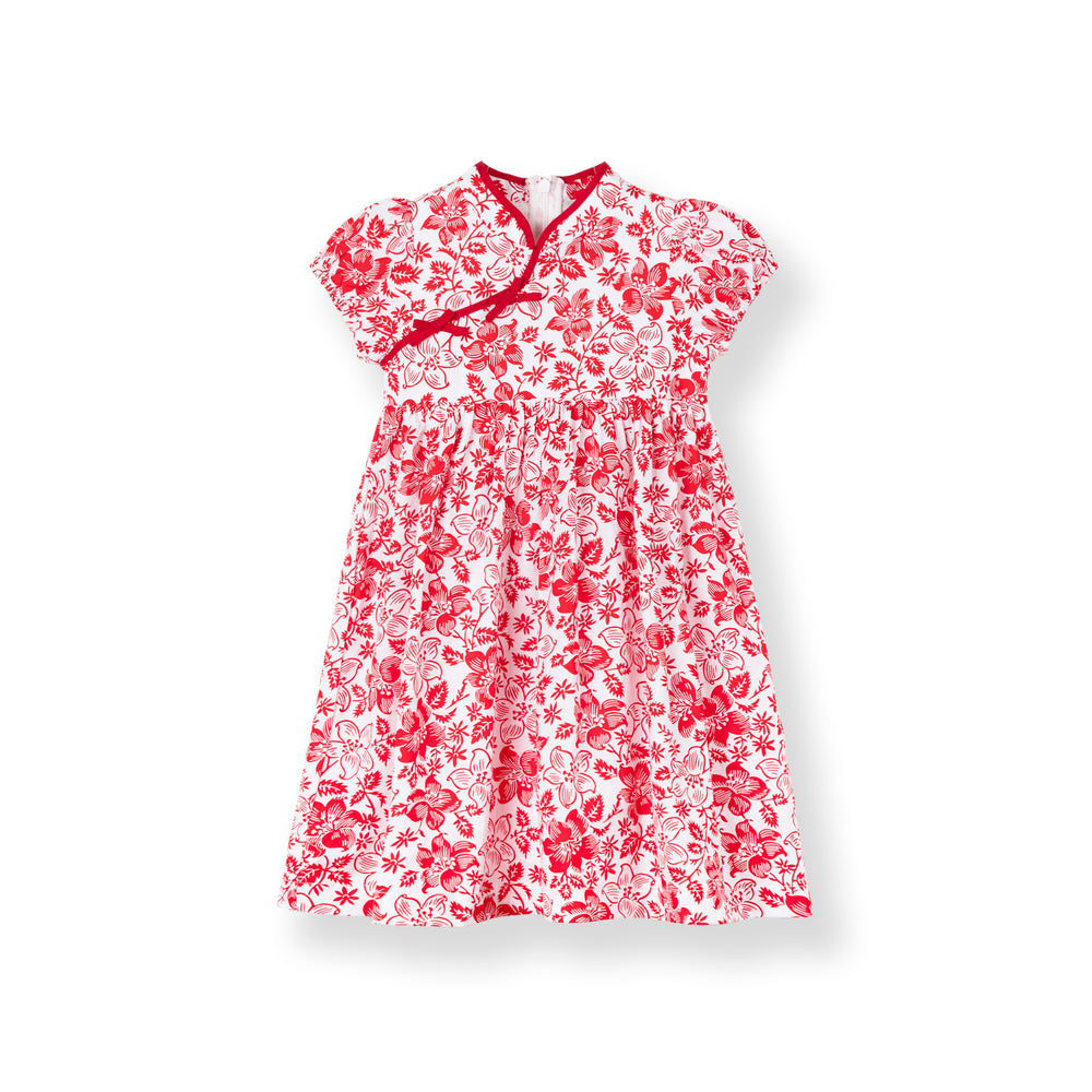 This red and white printed short sleeve dress features a mandarin collar with a ribbon detail, adding a chic touch that combines classic elegance with a modern twist. It has piping along the neck and cutline, with gathered details from front to back for a _x001F_attering _x001E_t. A back zip closure and an embroidered Poney logo at the hem to complete the look