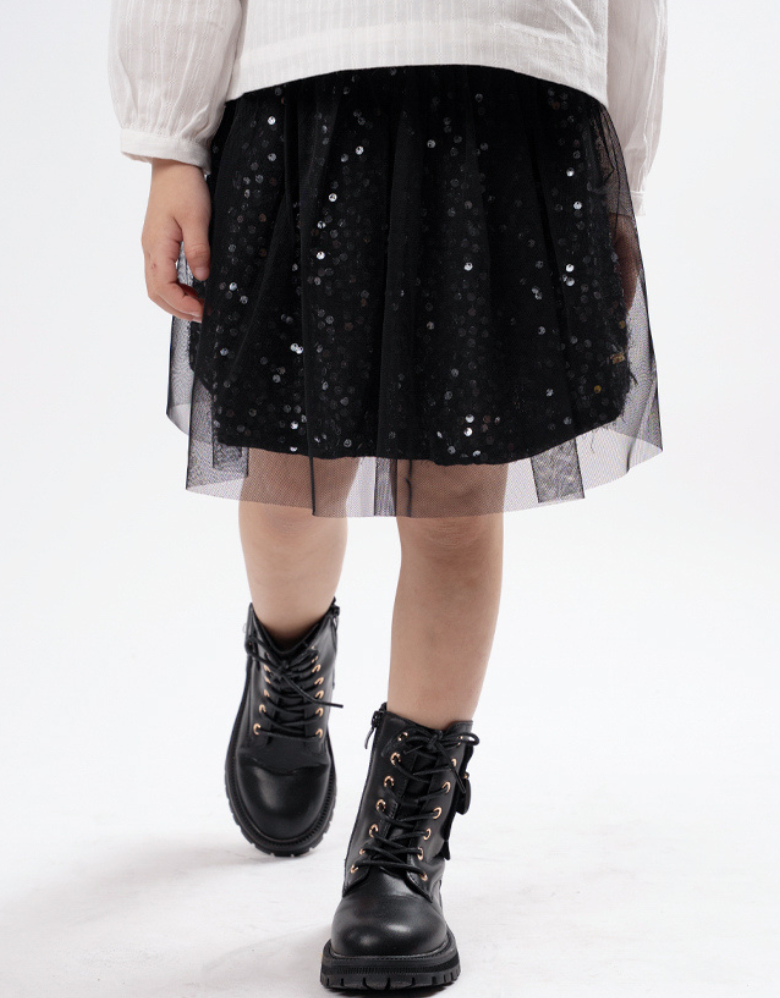 Flared skirt in sequined mesh with lining inside, an elasticated waistband with front to back gathered seam for added volume. Pair it with our shimmer sleeveless blouse, your little girls will surely love the sparkly look from these fits!