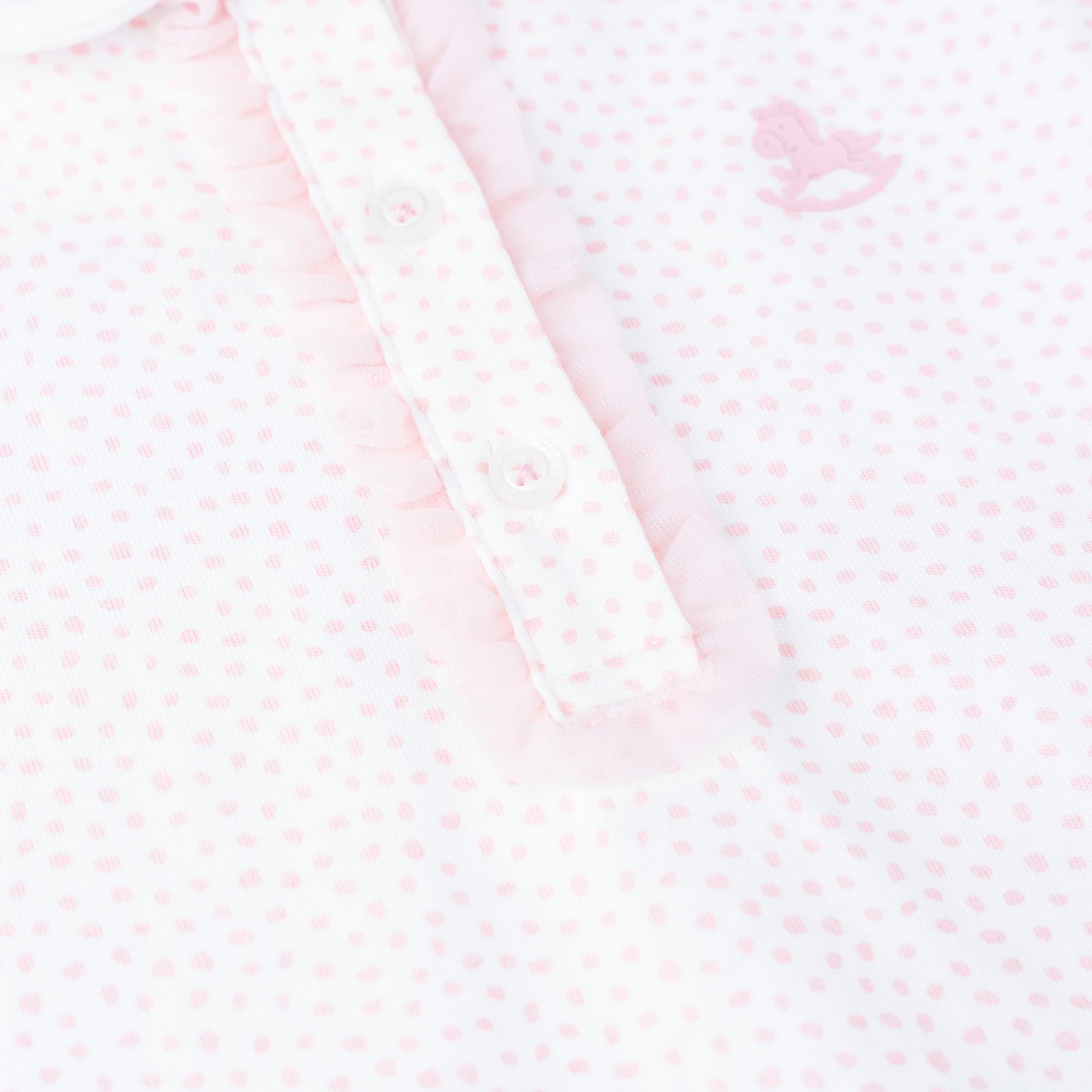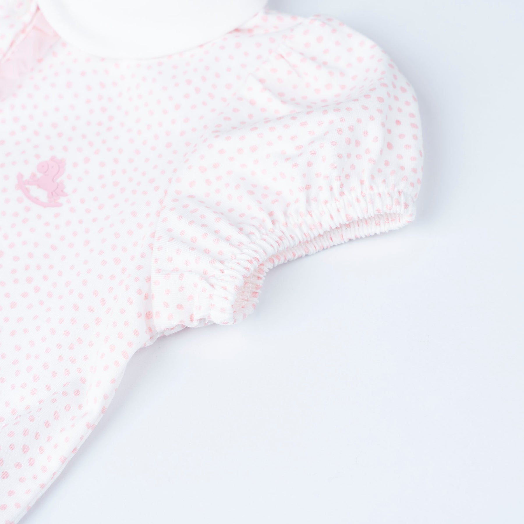 Our delicate pink dotted all-over print bodysuit comes with puffy sleeve, front button down